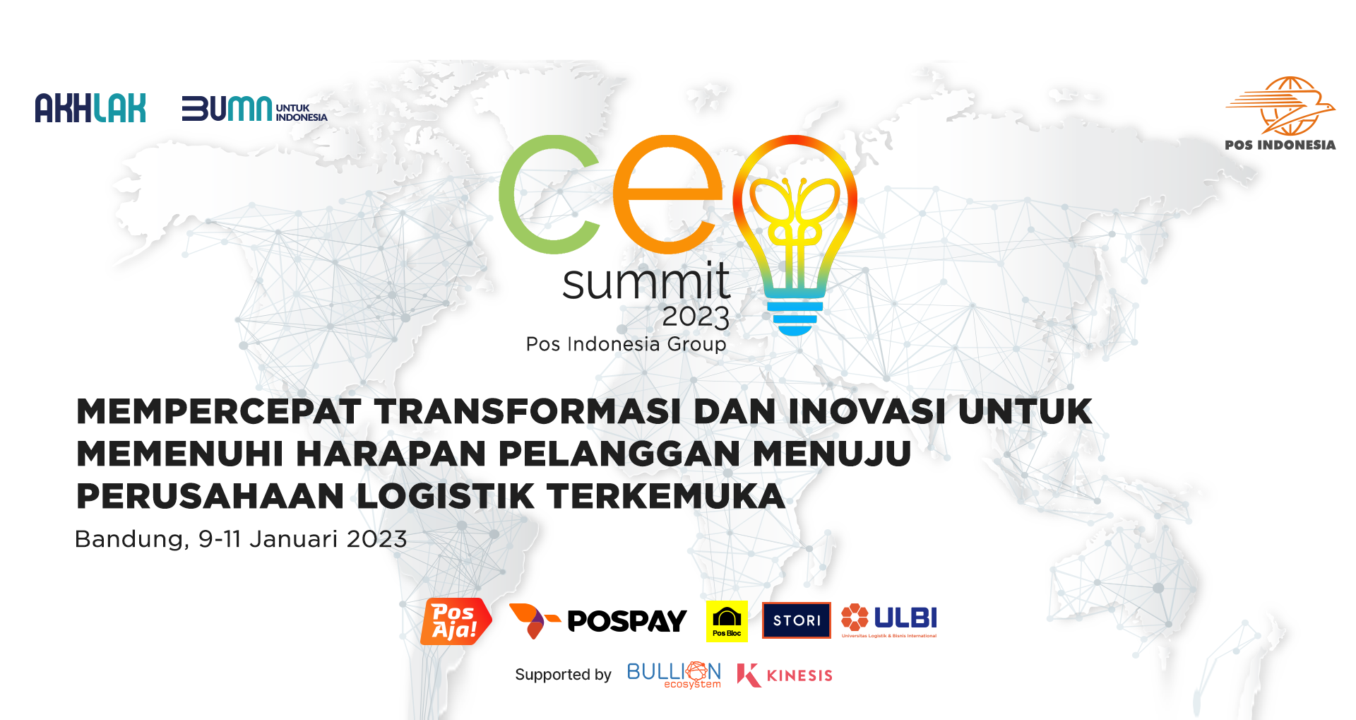 CEO Summit 2023 adalah pertemuan tahunan seluruh Pemangku Pimpinan Pelaksana (CEO) Pos Indonesia Group, dalam rangka berkoordinasi, menyatukan visi untuk pencapaian RKAP 2023. Kegiatan CEO Summit 2023 ini juga merupakan wujud pengawalan program percepatan transformasi dan inovasi, melalui arahan Direksi dan Senior Leader kepada para CEO untuk mempercepat transformasi dan inovasi untuk memenuhi harapan pelanggan menuju perusahaan logistik terkemuka.